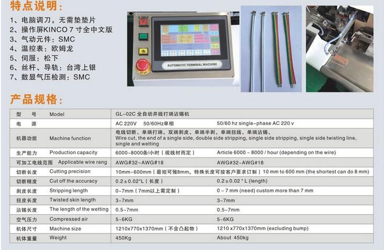 7. 全電腦數控調試:刀口大小,剝皮長度,打端深度,沾錫深度